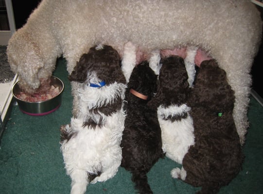 De pups hebben zich zeer goed ontwikkeld, hun groeicurve is heel stabiel. De reutjes wegen tussen de 4 en 5 kilo ondertussen. De teefjes zitten ruim boven de 3.5 kilo. Ze zijn allemaal gezond, zijn nooit ziek geweest en hebben geen enkele keer diarree gehad, zelfs niet na het ontwormen.