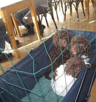 We zijn hier begonnen om de pups enkele basis-vaardigheden aan te leren. Ze zijn gewend aan de trimtafel en de tondeuse en we hebben ze spelenderwijs bekend gemaakt met betasten en verzorgen, zoals kammen, nageltjes knippen en het vasthouden van oortjes, pootjes en staartje.