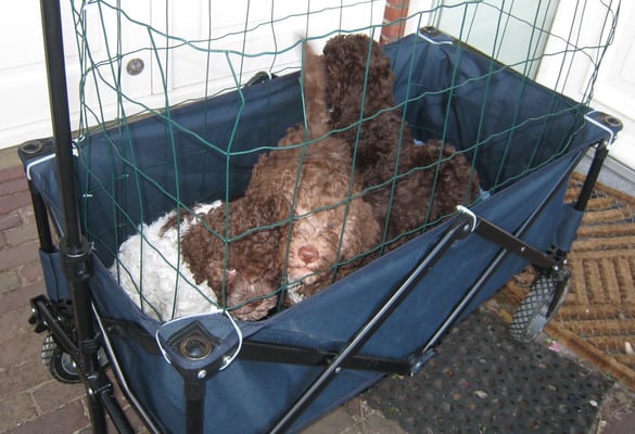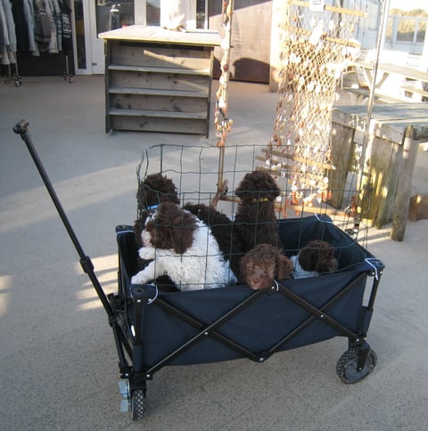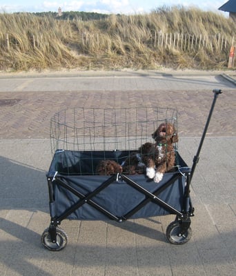 Vanmiddag heb ik de pups meegenomen in de bolderkar voor wat habituatie en socialisatie. Het is erg rustig in Bergen aan Zee in deze tijd van het jaar. Een vrachtwagen bijvoorbeeld hebben ze nog steeds niet gezien, ook vandaag weer geen succes. Veel mensen kwamen we ook niet tegen maar de enkele stellen die we tegen kwamen wilden wel meteen van alles weten over de pups en knuffelen natuurlijk. Gelukkig zijn ze niet meer te koop want ik zou binnen tien minuten zijn uitverkocht...