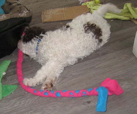 Vanmorgen kregen de pups bezoek en zijn ze verwend met knuffels en nieuwe speeltjes. Toen de pups diep in slaap waren heb ik één van de leuke nieuwe speeltjes, een gevlochten fleece-koord, in de puppyren gelegd. De pups hebben namelijk meteen in de gaten als er iets nieuws in de ren is verschenen. Toen de eerste pup, Siepi, wakker werd ben ik gaan kijken en inderdaad ging hij meteen op het nieuwe speeltje af. Binnen een minuut was alles wakker en ook bezig met het speeltje.