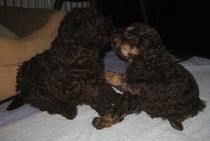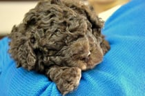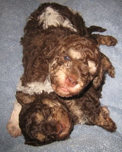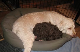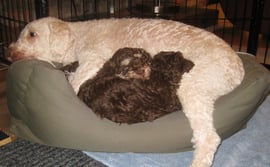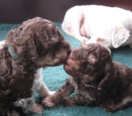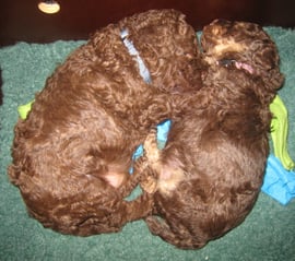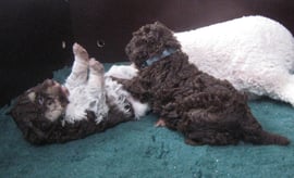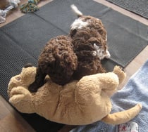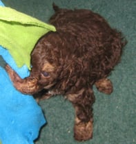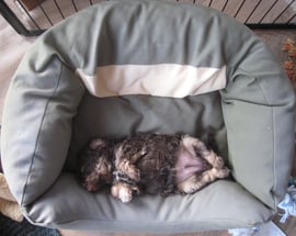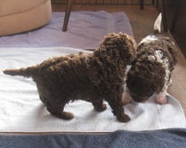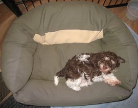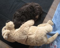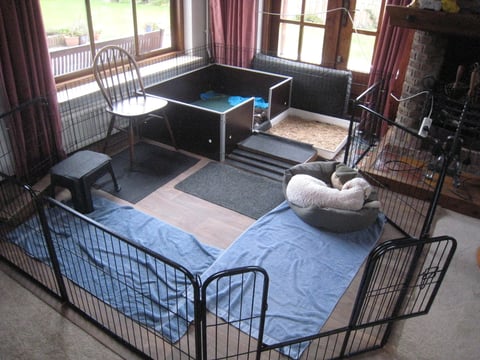 Een kleine tegenvaller was het zeil in de puppy-hoek. Dat leek in de winkel lekker ruw van oppervlak maar blijkt in de praktijk veel te glad. Daarom liggen er nu diverse doeken en matten in de ren want rennen en spelen op een veel te gladde vloer is heel slecht voor het ontwikkelende skelet van de hondjes. Voordeel is dat ze leren over allerlei verschillend aanvoelende ondergronden te lopen. Een nadeel is dat het wat meer bewerkelijk is met schoon houden.