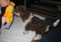 De pups gaan op steeds meer verschillende manieren met elkaar spelen. Duwen, bijten, spelgrommen, op elkaar springen en elkaar met de voorpootjes meppen leveren dolle pret op. Af en toe zijn ze elkaar ook heel lief aan het likken. Ze zijn flink verwend door iedereen met speelgoed en ook dat wordt allemaal uitgebreid onderzocht en uitgeprobeerd. Onze voeten worden ook als speelgoed beschouwd dus we moeten goed opletten dat we niet op een pup stappen als we door de ren lopen.