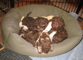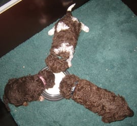 De pups beginnen wel al een beetje zindelijk te worden. Zeker als ze een paar uur hebben geslapen en bij het wakker worden in de korrelbak worden gezet doen ze allemaal braaf een plas. Af en toe gaan ze ook al uit zichzelf naar de bak om te plassen. Uiteraard gebeuren er ook nog ongelukjes, vooral na het spelen. Maar ze lijken te begrijpen waar de bak toe dient, al blijft het nog steeds een niet te versmaden slaapplaats.